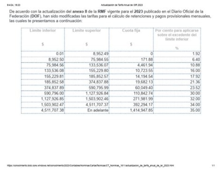 De acuerdo con la actualización del anexo 8 de la RMF vigente para el 2023 publicado en el Diario Oficial de la Federación (DOF), han sido modificadas las tarifas para el cálculo de retenciones y pagos provisionales mensuales, las cuales te presentamos a continuación: