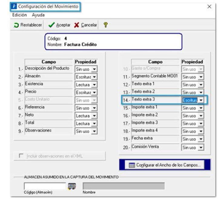 Habilita el campo Texto extra 3 como "Escritura" desde la pestaña 3. Movimiento en el Concepto que utilizarás. | |||