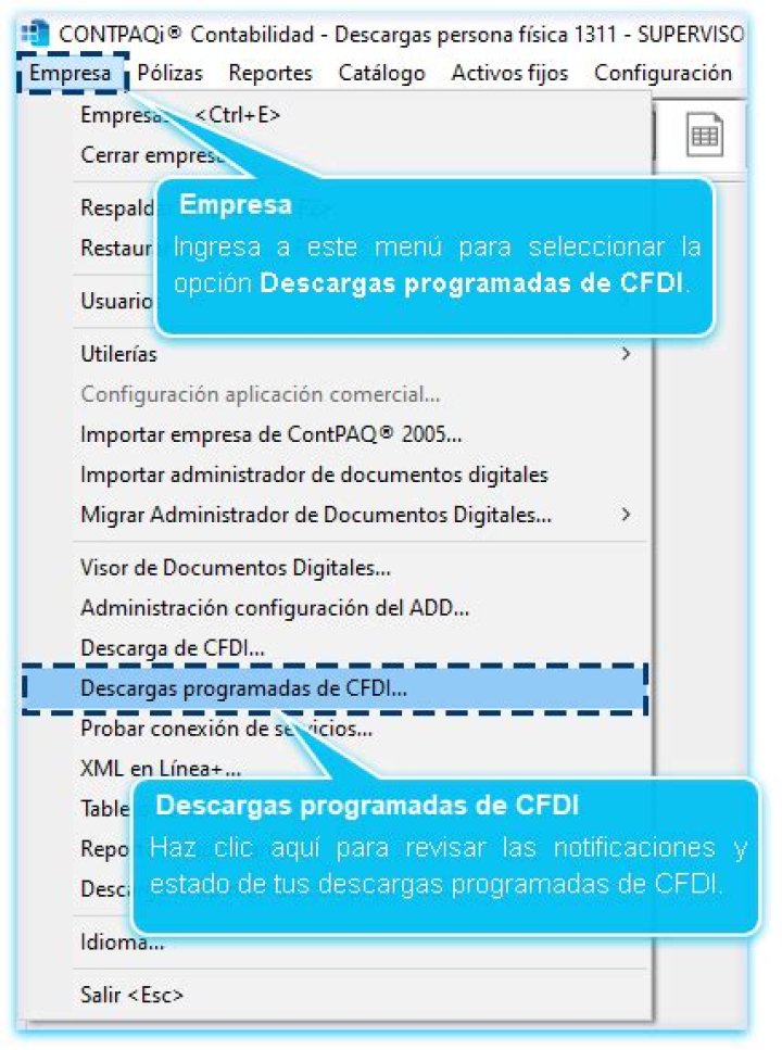 Importante Toma en cuenta que para el caso de las descargas programadas, los XML a descargar son de la fecha actual en adelante, pues se programan para que a partir del momento en que lo habilites puedan realizarse. Si deseas descargar CFDI de años, meses o fechas anteriores, se cuenta con el modulo de descargas manuales existente desde la versión 13.1.1 de CONTPAQi® Contabilidad y CONTPAQi® Bancos, y que se encuentra en el menú Empresa opción Descarga de CFDI. |