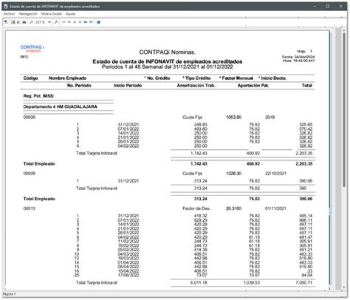 Este reporte te permite ver el detalle de los pagos realizados al INFONAVIT por cada empleado, se hará el desglose de cada tarjeta (un empleado puede tener más de una tarjeta) y después mostrará el total del empleado.