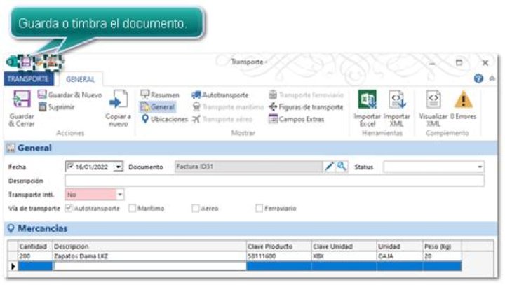 En el campo Transporte Intl. podrás indicar si se trata de un transporte Nacional o Internacional, en este caso es un transporte Nacional, podrás elegir una Vía de transporte o varias vías. Al elegir cada Vía de transporte en la estaña GENERAL se habilitarán los botones: Autotransporte, Trasporte marítimo, Transporte Aéreo o Transporte ferroviario, según las opciones seleccionadas, para que puedas asignar los datos correspondientes. En caso de que se trate de un traslado internacional, se mostrarán los campos: Entrada/Salda, País y Vía. | |||||