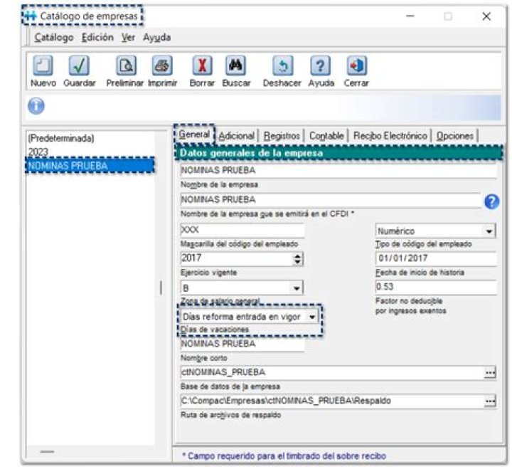 Al ingresar al Catálogo de empresas y seleccionar la pestaña Generales, en la sección Datos generales de la empresa, se incluye un nuevo campo Días de vacaciones, en el cual podrás elegir la opción para calcular los días de vacaciones del empleado con base a la nueva Reforma LFT.