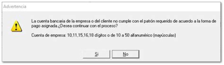 "La cuenta bancaria ordenante o beneficiaria no cumple con el patrón requerido de acuerdo a la forma de pago asignada ¿Desea continuar con el proceso?"